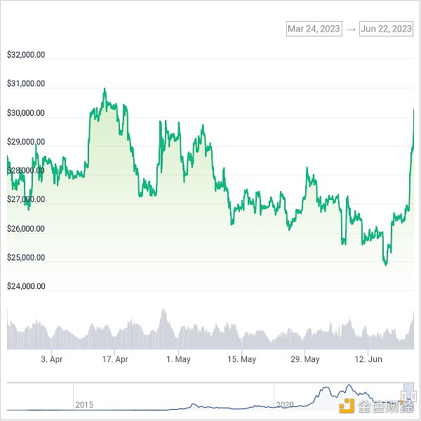 就在贝莱德提交文件一周后,比特币触及3万美元大关,为4月15日以来的最高水平。价格飙升 $4k 算大幅上涨 ,因为比特币已经数周在 2.5万-2.7万 范围内横盘。