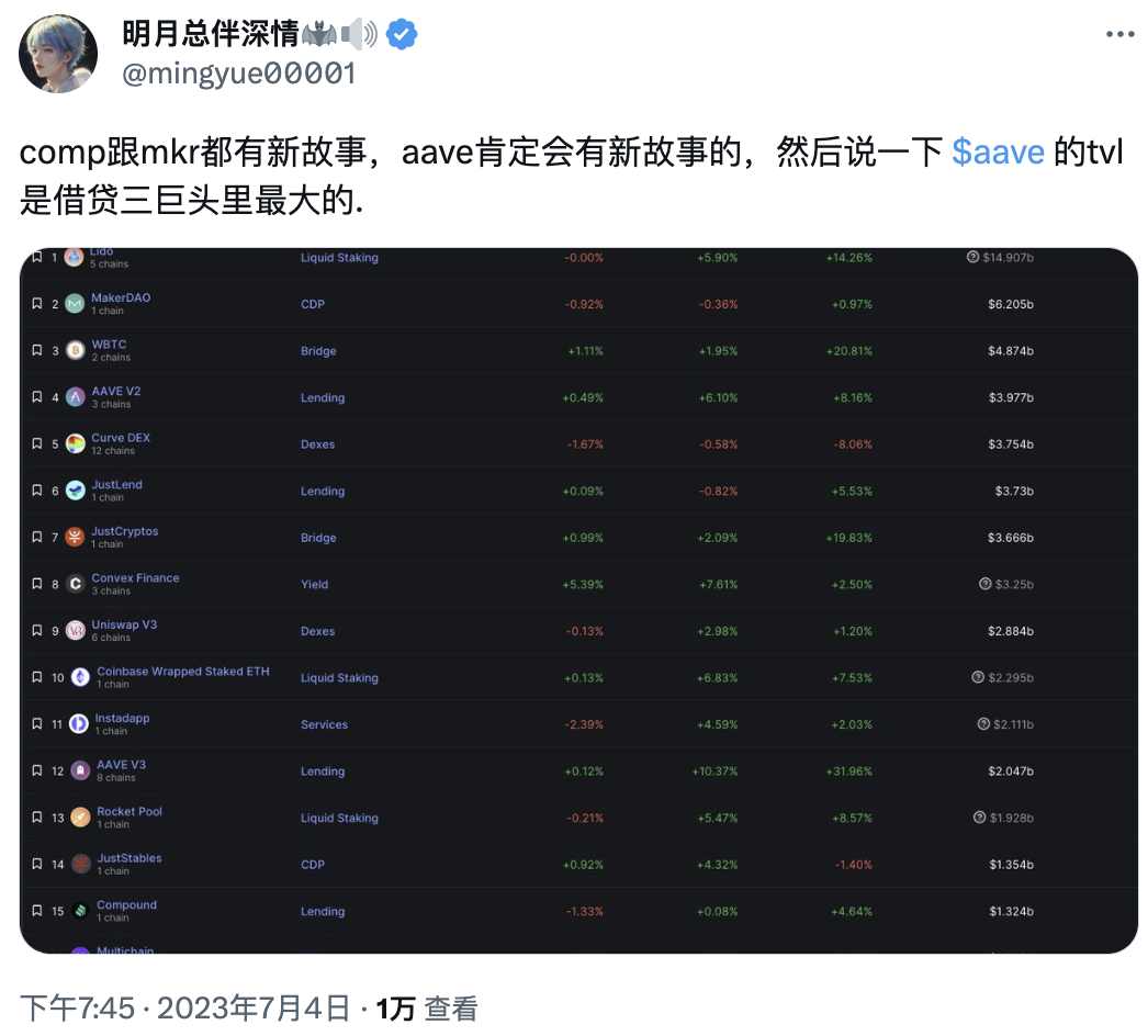 至于 Aave,有用户表示,Aave 作为比 Compound 更大的借贷平台,一方面可以获得 Compound 的流量,另一方面 Aave 本身也很可能会有新的叙事。