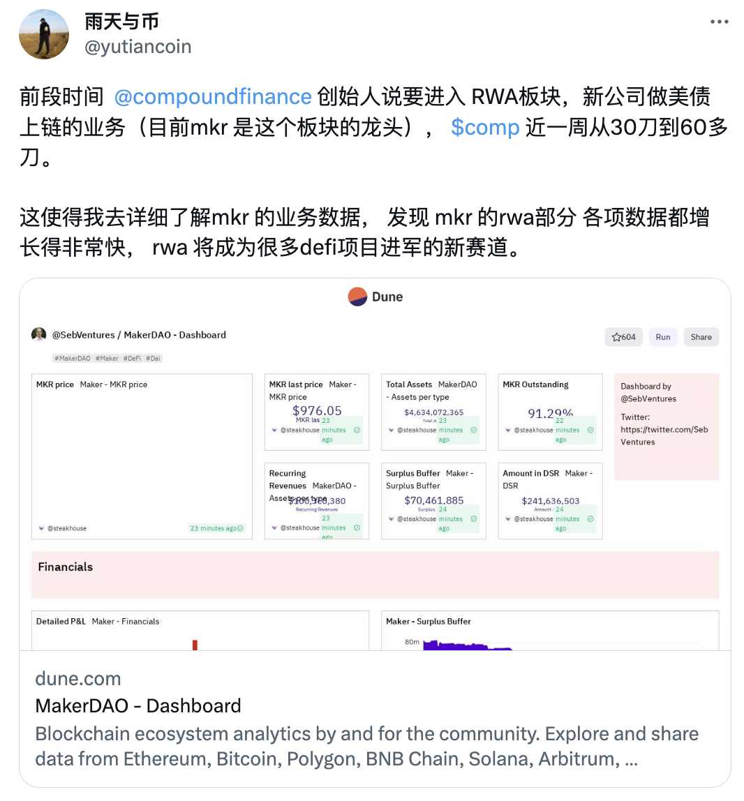 虽然 RWA 概念已经存在很久,但叙事与币价互有反身性,热心的用户一直在为本轮上着寻找逻辑。