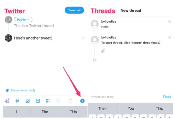 9、Twitter 和 Threads 发布主题帖的体验也不一样。在 Threads 上,用户必须按三次 Enter 才能启动主题帖,而在 Twitter 上,主题帖是通过加号按钮启动的,操作相比更友好。