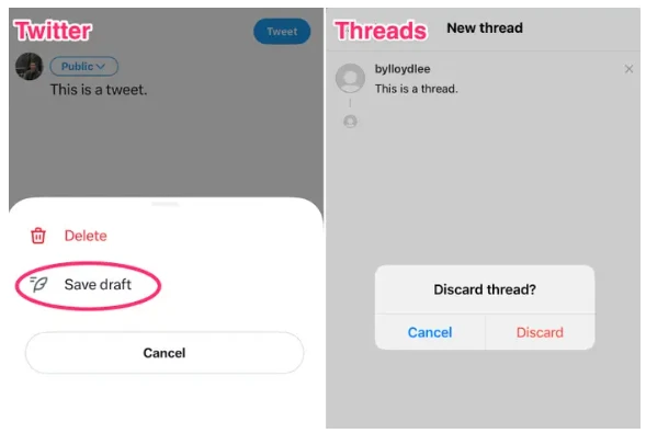 图 8 :Twitter 和 Threads 草稿功能对比