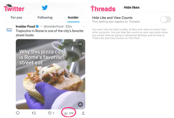 7、Threads 提供了隐藏用户帖子的点赞数的选项,但在 Threads 上隐藏点赞数也会隐藏用户 Instagram 个人资料上的点赞数。Threads 隐藏点赞数的选项功能似乎与马斯克接管 Twitter 时所做的一些改变相反,最近,Twitter 在每条推文下方添加了两个新数字功能:查看次数和书签数量。