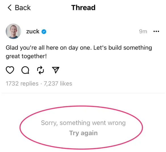 11、最后提一个小插曲,Threads 在推出后一小时内遇到了一些 Bug,部分用户报告出现无法访问的问题。