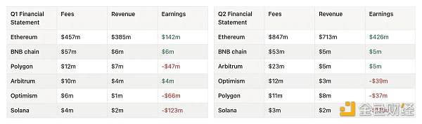 以下是加密货币领域市值较大的 L1 和 L2 区块链的财务报表。数值解释如下: