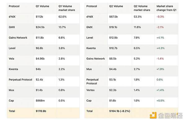 相比于第一季度,总交易量下降了 8.2%,考虑到我们在第二季度所经历的普遍熊市环境,这并不算跌得多。尽管 dYdX 在交易量方面仍然明显领先,但该协议在季度间的市场份额出现了大幅下降。GMX 和 Gains 等其他“OG”永续交易所也是如此。
