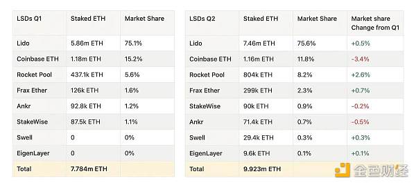 从第一季度到第二季度,获益最多的项目是 Lido、Rocket Pool 和 Frax Finance。Lido 不仅流入了 160 万 ETH(30 亿美元),而且尽管出现了新的竞争对手,该协议也获得了可观的市场份额。