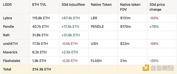 LSD 领域在第二季度取得的巨大增长不太可能在第三季度以同样的速度持续下去。更高的质押率和较少的链上活动导致年化收益率普遍下降。在回报率更低的情况下,质押者正在寻找增加收益的方法,而这就是 LSDfi 协议的作用所在。下表是上周新闻简报中的数据,展示了顶级 LSDfi 项目的当前统计数据。
