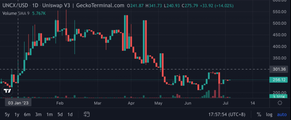 另外 UNCX 有发行了同名治理代币 $UNCX 与奖励代币 $ UNCL ,但在代币模型与价值捕获这块并无着墨,仅有老套的质押挖矿与回购燃烧代币机制,燃烧甚至自 2021 年四月份后再也无纪录,项目赚钱并无法有效地让代币持有者获利,也导致治理代币 $UNCX 币价并未随着项目的收益上涨而有所改变。