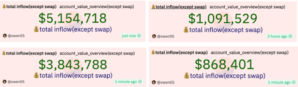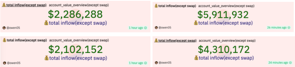 分析其收款地址 0x997cc123cf292f46e55e6e63e806cd77714db70f 做出分析得出,从 2023 年初至此获利超过 4.5 M USD ( 下图左为 ETH 右则为 BSC ),而近一个季度受到 Memecoin Season 影响,获利高达 2.5 M USD。