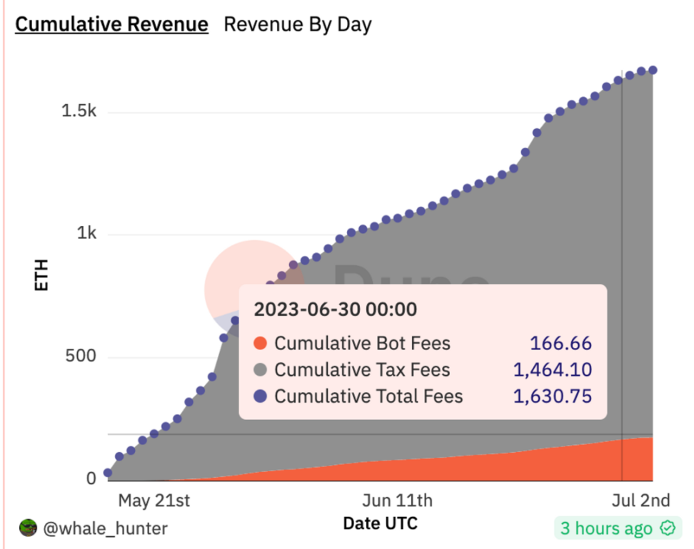 Unibot 盈利模式与 Maestro 相同,都是从用户交易金额中抽取 1% 作为手续费,但受益于 Unibot 代币机制,$Unibot 本身是一个含税代币,交易中买或卖皆须支付 5% 的代币作为税收,这一部分也被视作项目方收益。从项目上线至今,累积收益突破 1630 ETH 约 3 M USD,其中 166 ETH( 300 K USD)来自于手续费收入。