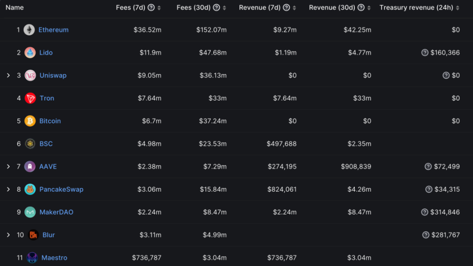 尽管这一个月 Memecoin 相对熄火,但 Maestro 仍然在 Defillama fees and revenue 看板中高居第十一名,胜过许多大名鼎鼎 Defi 协议例如 Metamask、 Compound 以及 Curve 等等,甚至公链项目例如 Arbitrum 、 Optimism 、 Avalanche 以及 Polygon 也只能望其项背。