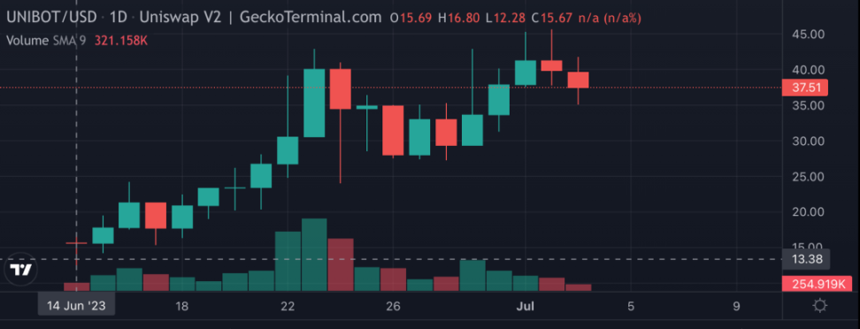 Unibot 相较于上述的四个项目而言相对年轻,今年五月份才刚上线,产品与代币同上线,而其代币采用公平发射的方式,最高涨幅高达 400 倍,可以说是这一季度的神币。