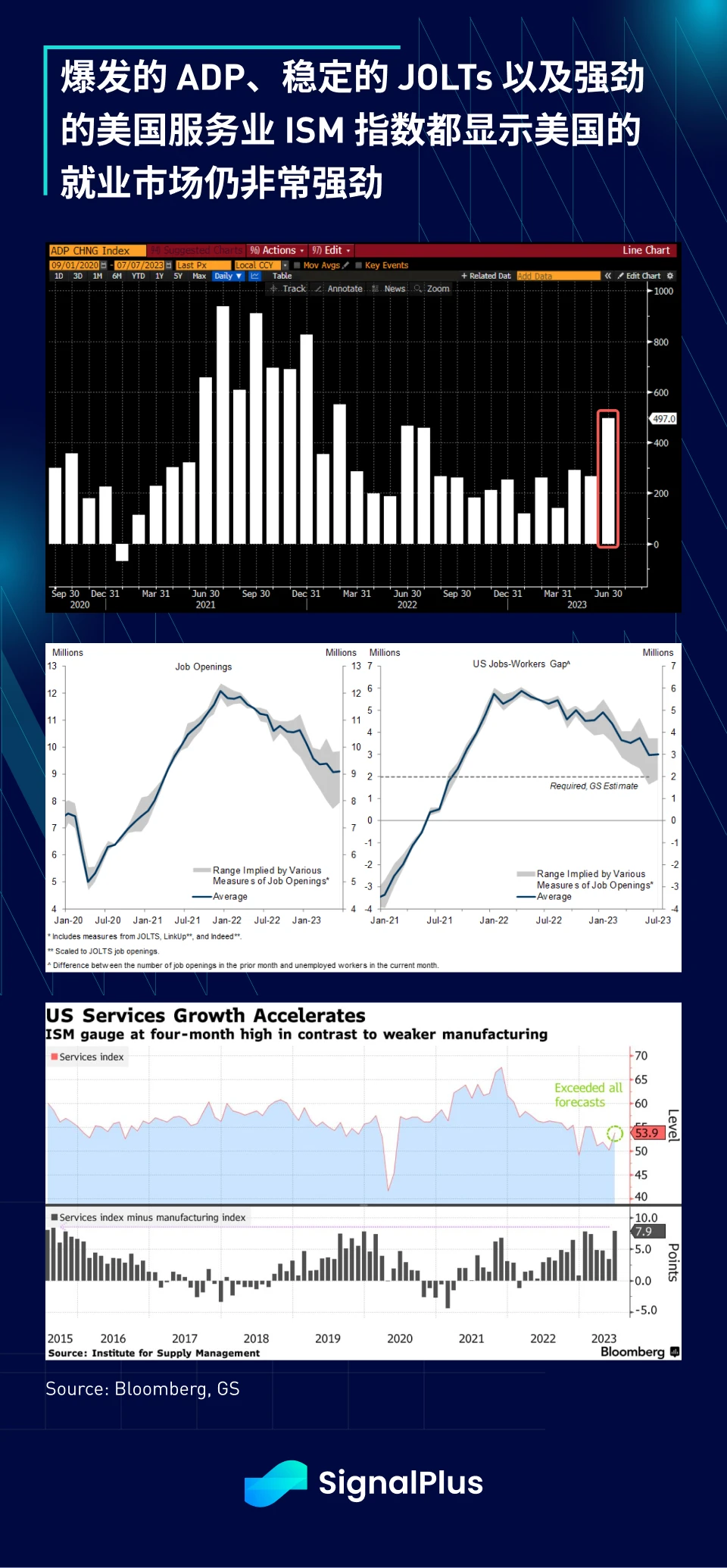 昨天迎来密集的经济数据发布,数据结果比夏天的天气还要炙热;德国工厂订单数据强势开场,环比增长 6.4% ,远高于预期的 1.2% , 但真正让市场狂欢的是 ADP 数据,就业人数增长出现令人难以置信的 49.7 万,而预期仅为 22.5 万(服务业 + 37.3 万,制造业 -42.0 万) ,且当周申领失业金人数维持稳定(24.8 万),同时 Challenger 企业裁员人数降至去年 10 月以来最低水平 ,尽管 JOLTS 数据略显平淡,职位空缺与失业人口比率跌至 2021 年 10 月以来最低(1.6 倍),与辞职率的反弹(更多的自愿辞职)互相平衡, 不过 ISM 服务业指数的表现足以弥补任何失望,整体指数以及新订单(55.5 vs 52.9)和就业(53.1 vs 49.2)项目均超出预期。