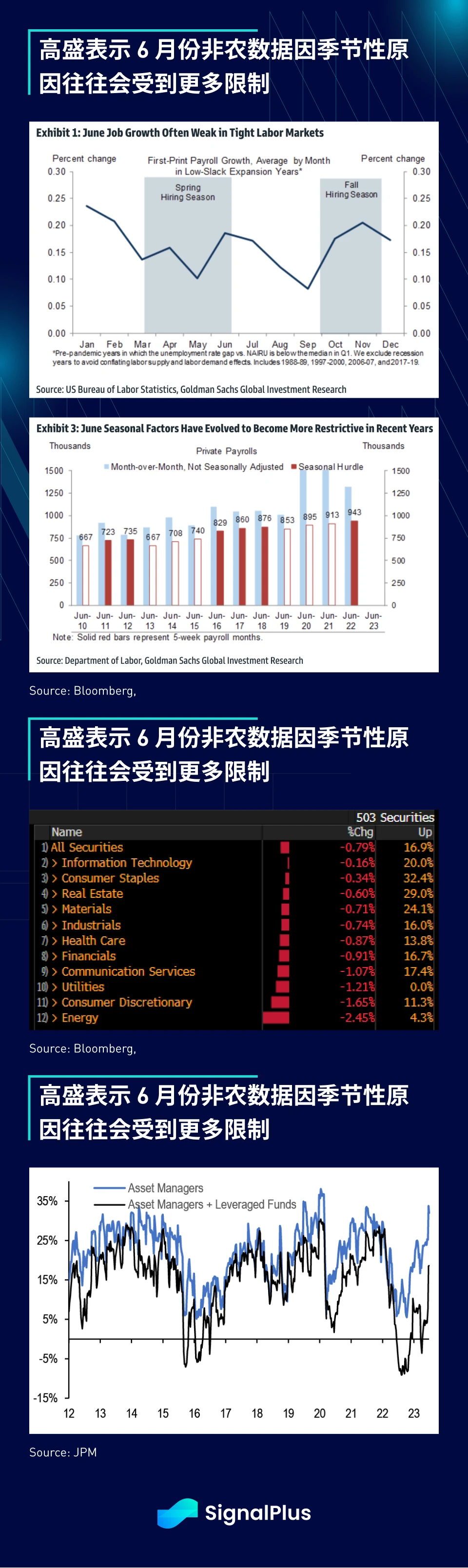 由于 ADP 数据的爆发,今天市场对非农数据的期待毫无疑问已经提高,不过高盛警告, 6 月份的数据因季节性原因,往往在就业增长方面较为限制,因此高预期有机会带来失望。在股票方面, 昨日 SPX 指数所有板块均出现下跌,因市场担心收益率再次回到持续升高的主轴,此外,摩根大通的调查数据显示,机构资金经理人的风险敞口已接近历史最高水平 , 如果第三季度市场出现意外的抛售,当前的市场布局将很难应对。