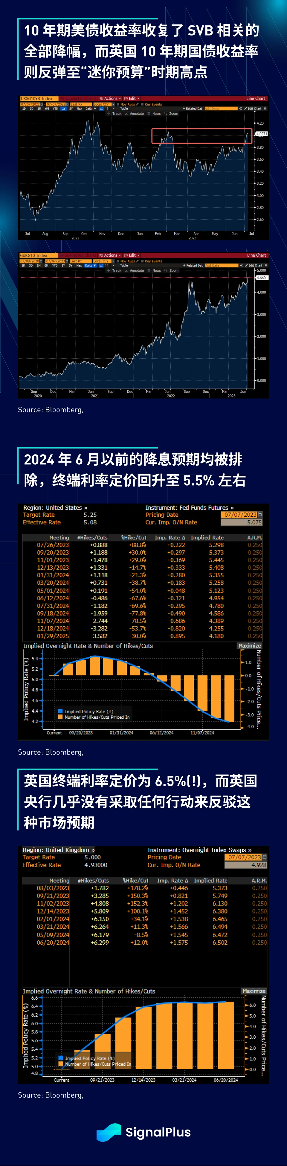 债券市场做出相应反应,美国 10 年期收益率收复了所有与 SVB 相关的降幅,收于 4% 以上,而 2 年期收益率收盘回升至 5% 以上, 2024 年 6 月之前的降息预期都被移除(终端利率约为 5.45% );在大西洋彼岸,对于市场大胆地将终端利率定价在 6.5% (!),英国央行 Bailey 并未做出太多的反驳,使得英国 10 年期国债收益率也反弹超过 Liz Truss 迷你预算案时期的高点。