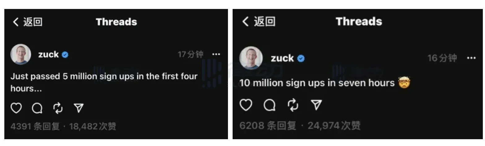 上线的第一天,Threads 的数据表现亮眼,扎克伯格表示,Threads 上线 4 个小时内已有超过 500 万名用户注册,到上线 7 个小时已有超过 1000 万名的用户注册。