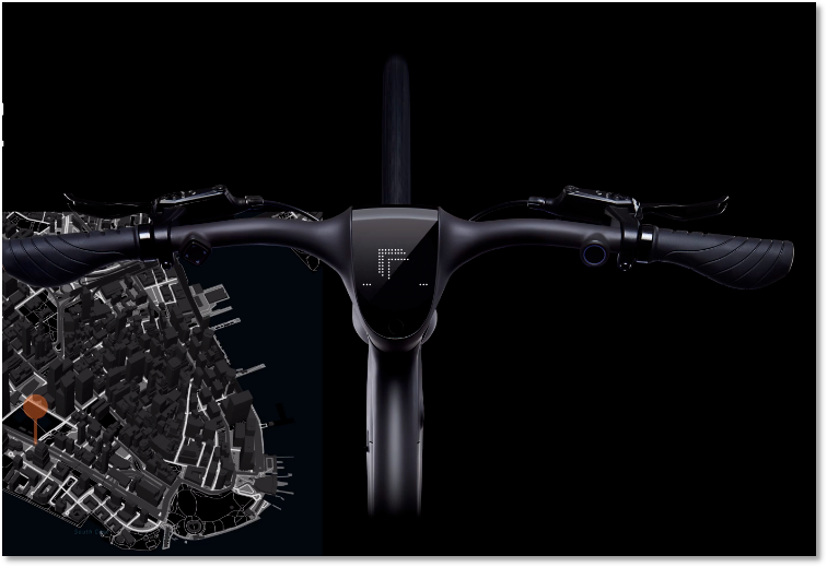 科技感体现在车把手中间的LED点阵屏上,如下图所示,在骑行过程中,它会以箭头的方式进行实时导航,车把右侧的“圆形钮”则是和老款iPhone手机相似的指纹解锁按钮,轻触即可启动单车的电机,在骑行中提供电助力。