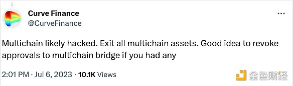Curve Finance 官推警告称:“ Multichain 可能遭到黑客攻击。退出所有 Multichain 资产,如果您有的话”。