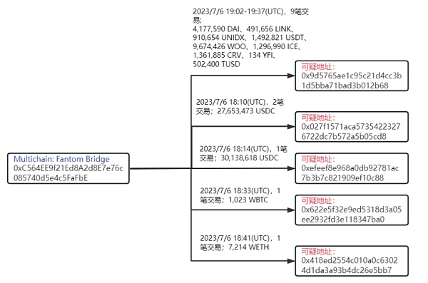 根据链上记录可以看到最初的可疑交易0xde3eed5656263b85d43a89f1d2f6af8fde0d93e49f4642053164d773507323f8,从交易后进行了大量的资产转移,其中包括从 Multichain 的 Fantom 桥转移 4,177,590 DAI、491,656 LINK、910,654 UNIDX、1,492,821 USDT、9,674,426 WOO、1,296,990 ICE、1,361,885 CRV、134 YFI、502,400 TUSD 到可疑地址 0x9d57***2b68;转移 27,653,473 USDC 到可疑地址 0x027f***5cd8;转移 30,138,618 USDC 到可疑地址 0xefee***0c88;转移 1,023 WBTC 到可疑地址 0x622e***7ba0;转移 7,214 WETH到可疑地址 0x418e***5bb7。