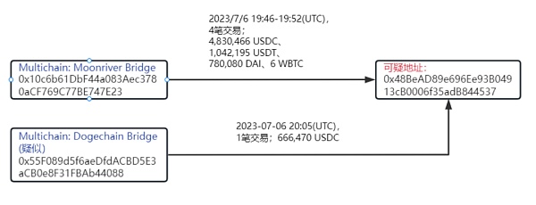 以及从 Multichain 的 Moonriver 桥转移4,830,466 USDC、1,042,195 USDT、780,080 DAI、6 WBTC 到可疑地址0x48Be***4537。另外从疑似 Multichain 的 Dogechain 桥地址0x55F0***4088转移了 666,470 USDC 到可疑地址0x48Be***4537。