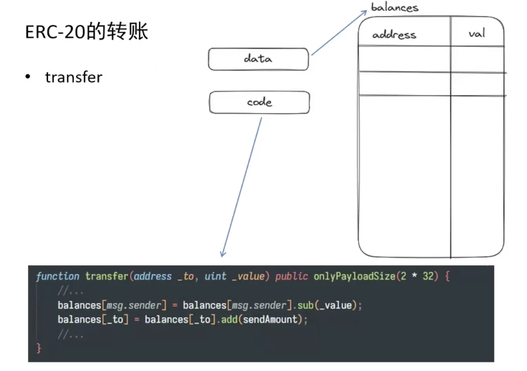 首先以 USDT 的智能合约为例:它包含了代码和数据,数据部分可以理解为一个表格,记录了每个 EOA 拥有多少 USDT,即每个 EOA 的余额。在转账时,会扣除一个账户的余额,然后给另一个账户的余额增加。