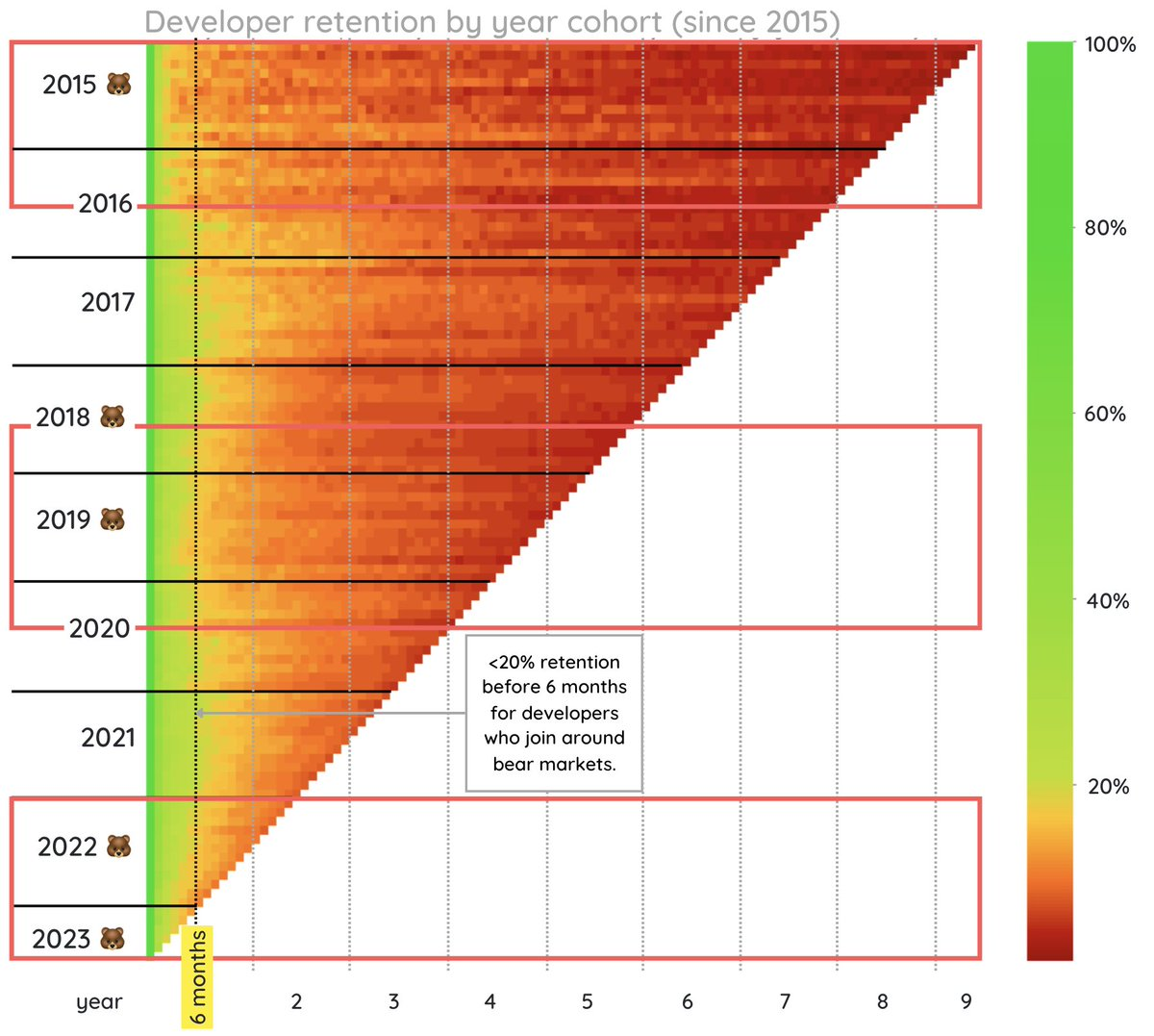 整体来看, 2023 年的留存率表现稳定。但如果数据从 2015 年开始,我们发现在熊市中加入的开发者离开得更快。2023 年的新人开发者比 2022 年或 2021 年离开得更快,这在熊市中是典型现象。