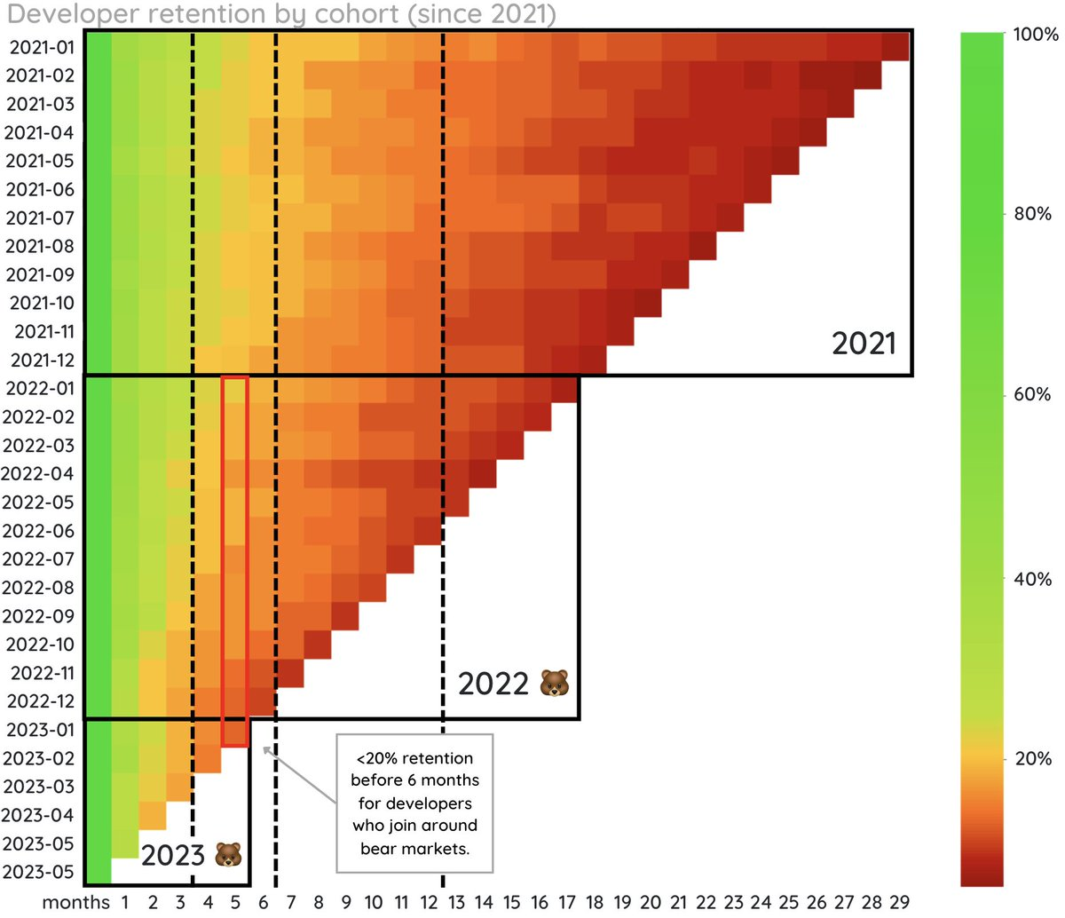 下图显示,从 21 年 1 月起,大多数新人开发者在加密货币领域多久后选择离开(留存率 <20% ):
