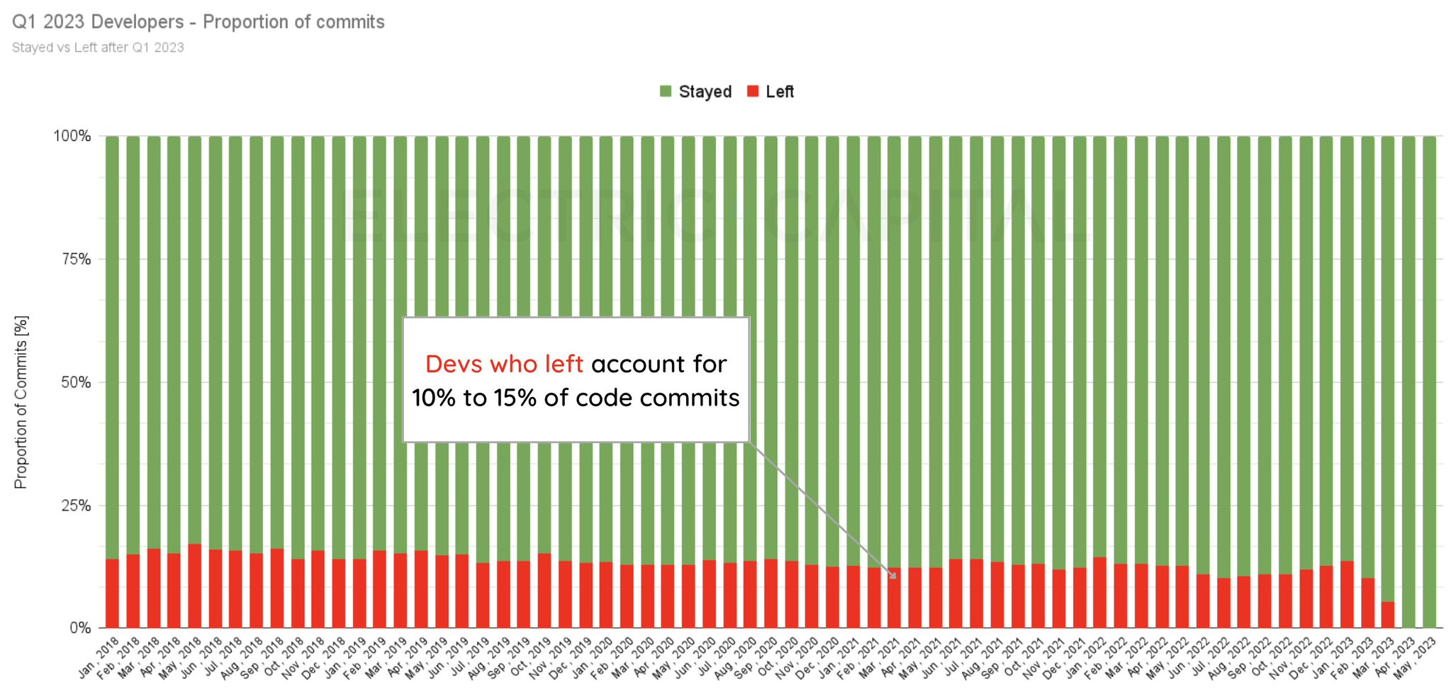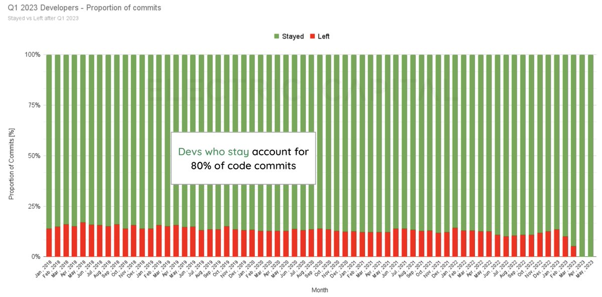 如果一个开发者在两个月内没有贡献,我们可以认定该开发“离开”加密领域。23 年 3 月之后停止贡献的开发者只占提交量的 <20% 。