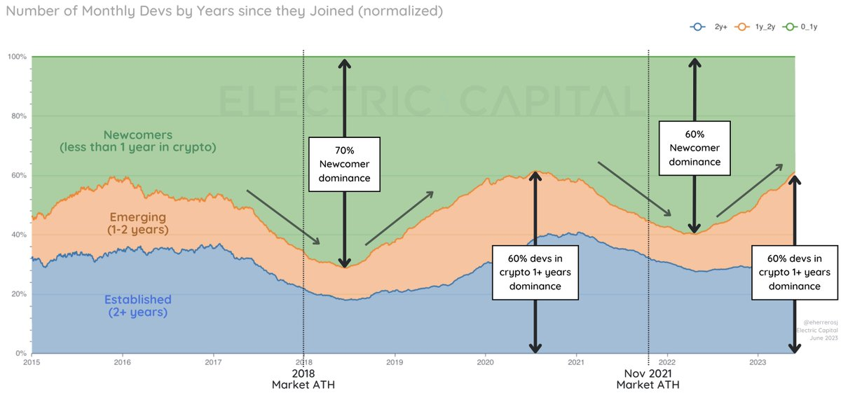 市场周期是造成新人、新兴和成熟加密货币开发者在市场不同时期各自占据主导的原因。