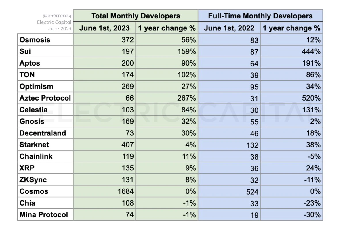 Osmosis、Sui、Aptos、Ton、Optimism、Aztec Protocol 的开发者数量实现同比增长。