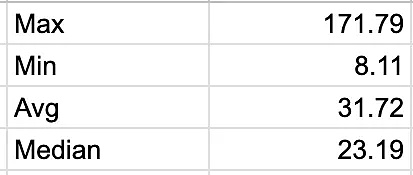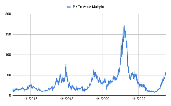 比特币网络的价值是对未来将发生的交易量的一种预测。为了了解可能性,我查看了从 2015 年开始的倍数。我计算了比特币网络上 BTC 传输的每日价值,不包括返回给发送者的“找零”行为。然后,我计算了每年的中位数,以获得不受每日过高或过低值的影响。最后,我将当天的比特币市值除以中位数,得出远期倍数(即预测的盈利表现)。