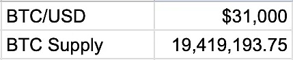 BTC 价格预估 = (([AI 经济规模 %] * [2022 年 GDP / 365] * [比特币市值与每日交易价值的倍数] * [100% 支付速度百分比]) / [BTC 总供应量]) + BTC 美元现货价格