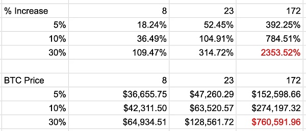 请记住,如果市场认为我的假设在未来有可能成立,那么市场就会为比特币网络的增长付出过高的代价。当市场价格从“永远不会发生”调整到“也许可能发生”时,赚到的钱最多。