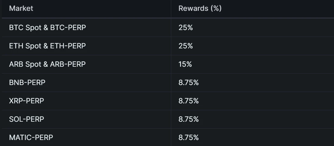 Initial token phase 一共有 6 个 epoch,每个 epoch 28 天,每个 epoch 奖励 1500 万个代币,目前为第 3 个 epoch。交易激励代币占比主要考虑交易费用的权重。此外,不同的交易对有不同的奖励,具体如下图所示: