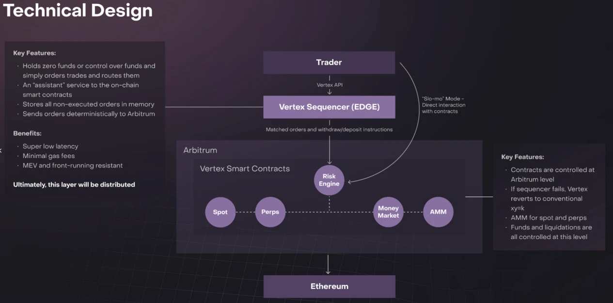 流动性供应模式是 Vertex 与其他衍生品 DEX 的主要差异。Vertex 认为,链下订单簿通过 FIFO(先进先出)处理,可以降低 MEV 攻击,并且提高交易执行速度。而链上 AMM 提供无需许可的流动性支持,交易者可以强制进行交易,在订单薄流动性不足的时候,可以保证交易的有效开展。