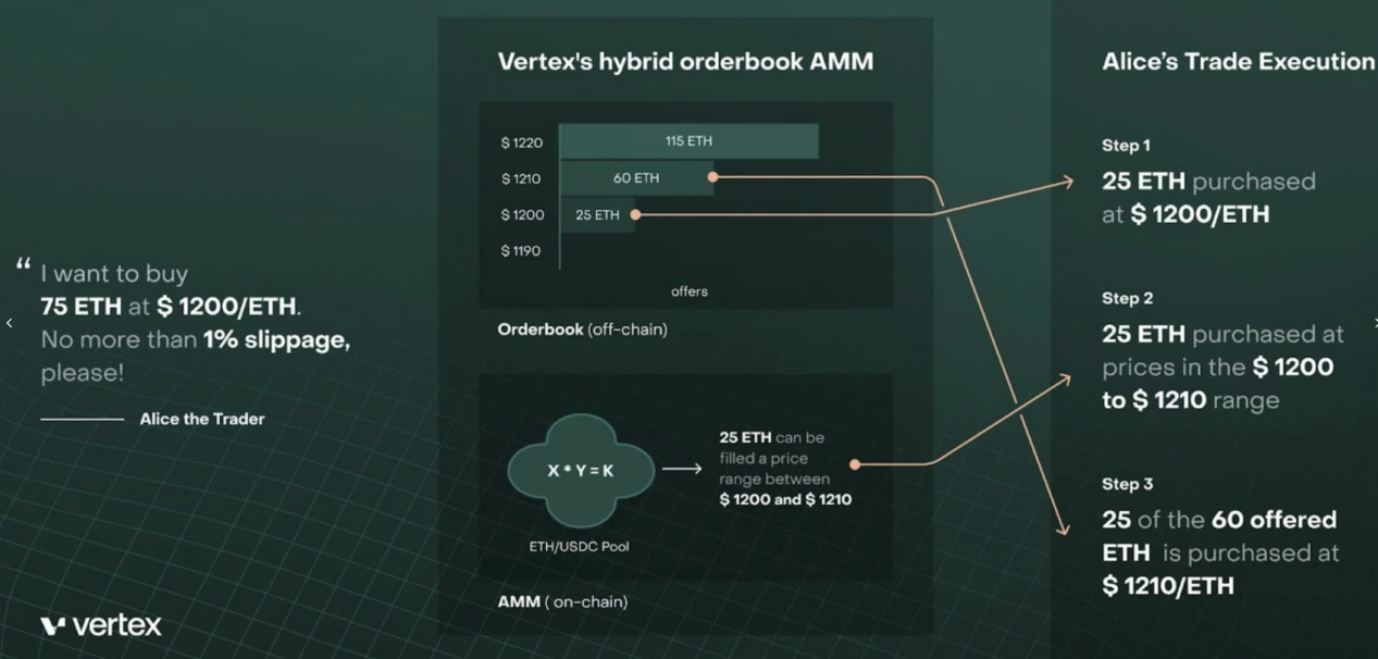 Vertex 通过以下几个组件,实现混合订单薄-AMM 模式: