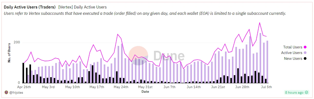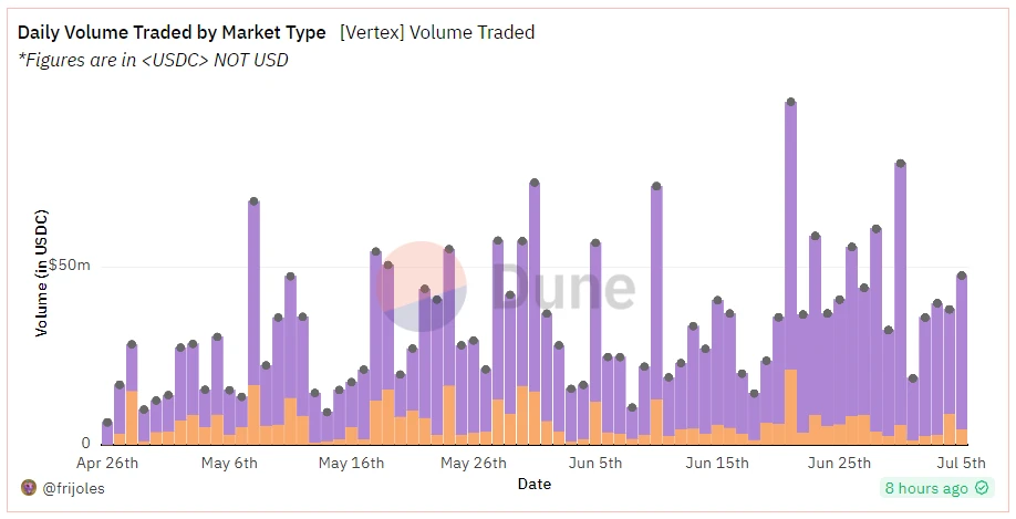 Vertex Protocol 是新近表现较好的一个衍生品 DEX 协议,其自 2023 年 4 月底上线以来,近期日交易量约占资金池模式衍生品 DEX 市场的 10% 至 15% ,并于 2023 年 6 月获得 Wintermute 的战略投资。