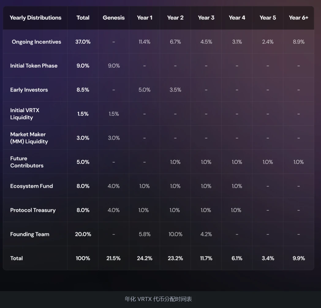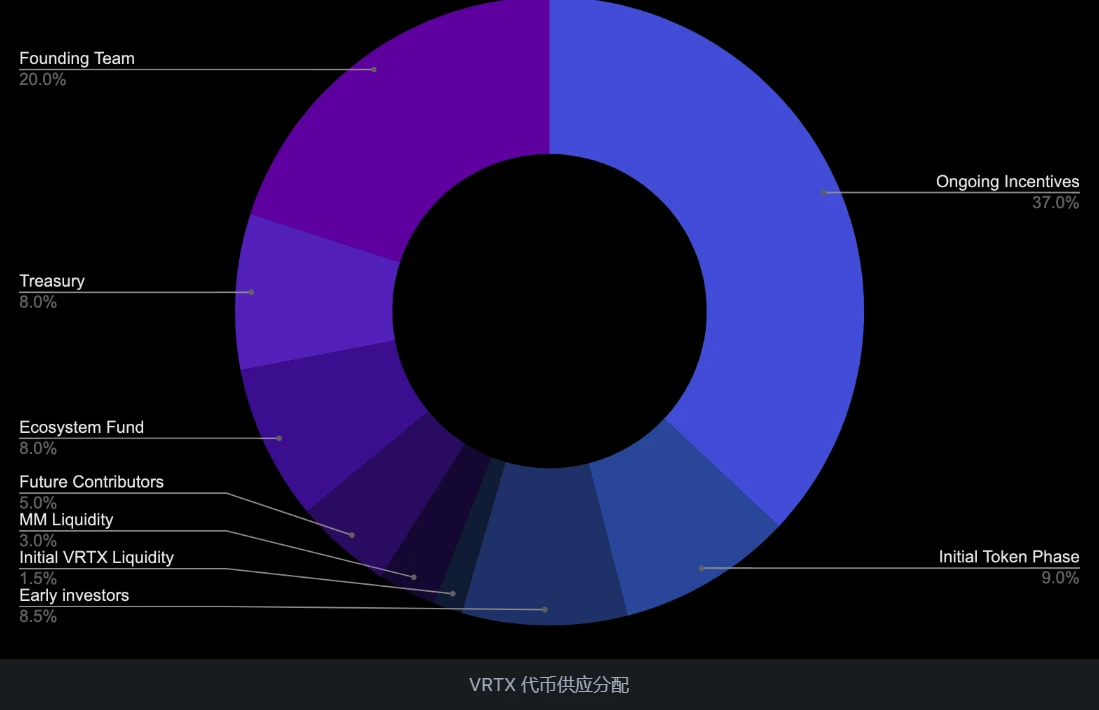 VRTX 是 Vertex Protocol 的治理代币,总供应量为 10 亿枚,其中, 90.08% 的代币将在 5 年内分发。