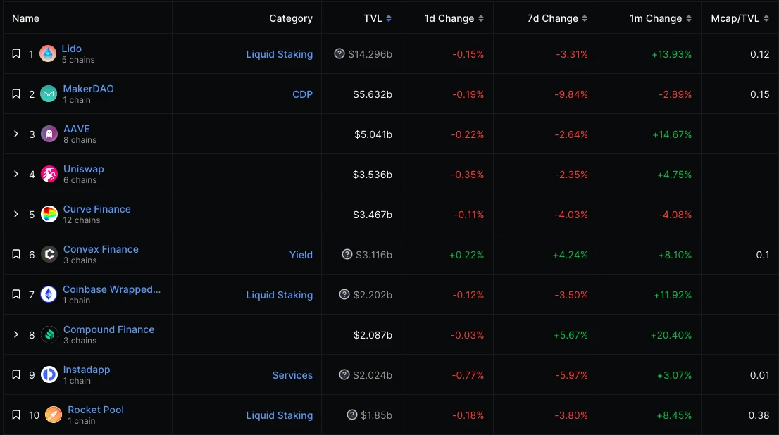 DeFiLlama 数据显示,上周链上锁仓抵押品价值从 269.8 亿美元下降至 260.1 亿美元,环比下降 3.5% 。从单个项目来看,锁仓价值前三名分别是:Lido 142.9 亿美元; MakerDAO 56.3 亿美元; Aave 50.4 亿美元。