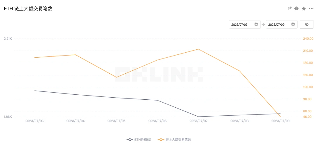 欧科云链 OKlink 数据 显示,上周链上大额交易笔数达到 1144 ,相较于前一周(1713)环比下跌 33.2% ,巨鲸交易热情明显下降。