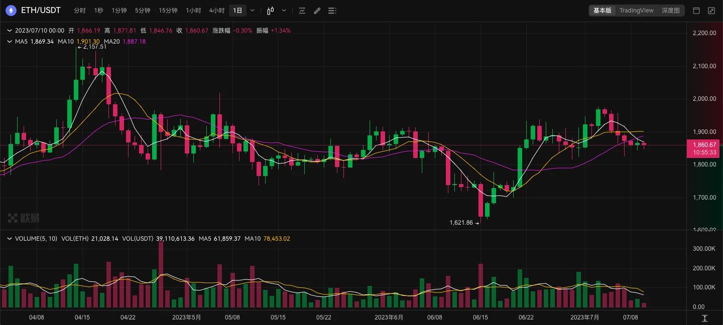 二级市场方面,目前 ETH 价格短时可能继续盘整,支撑位 1850 美元,阻力位 1900 美元。
