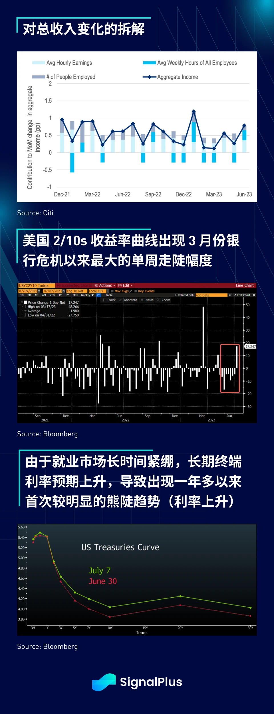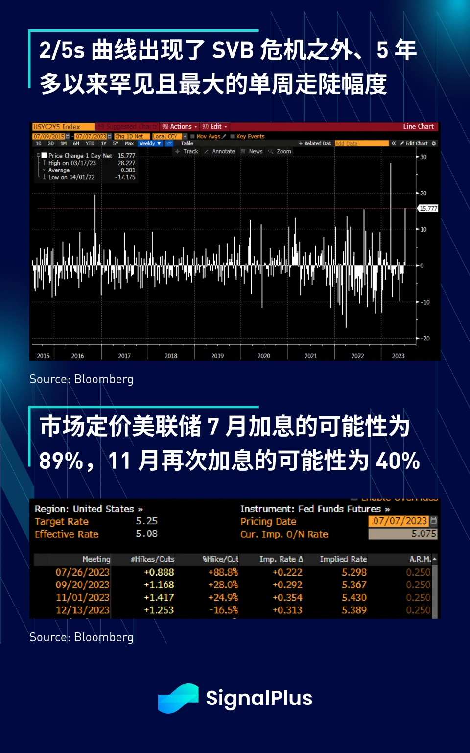 此外, 收益率曲线一年多来首次出现持续且较显著的熊陡走势(即长天期利率上升) , 2 年期收益率能够守住 5% 的阻力位,而 10 年期收益率则干净利落地突破 4% 水平,收在 4.06 %,更重要的是, 2/5 s 曲线出现 6 年来 (除了 SVB 危机时期以外) 罕见且最大的单周走陡幅度,显示出债券市场急于消除 6 月“跳过加息”所带来的任何鸽派余韵 , 7 月份加息的机率在上周五收盘时为 89% ,且市场预计 11 月会议前还有 40% 的机率会再次加息。