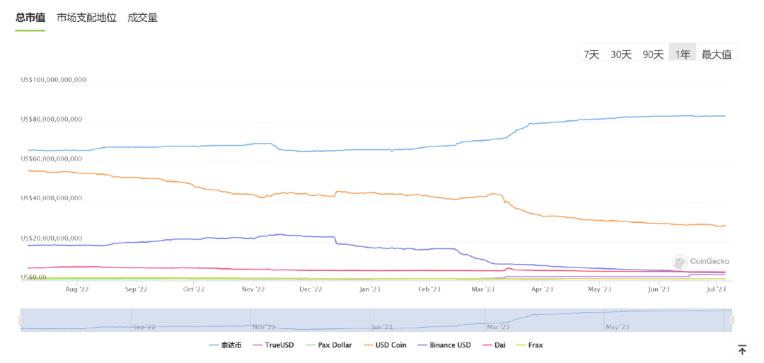 虽然 DAI 目前市值上已经实现对 BUSD 的反超,但整体来看其实是不断收缩的,这与其 3 月硅谷银行风波期间受 USDC 脱锚影响有关。