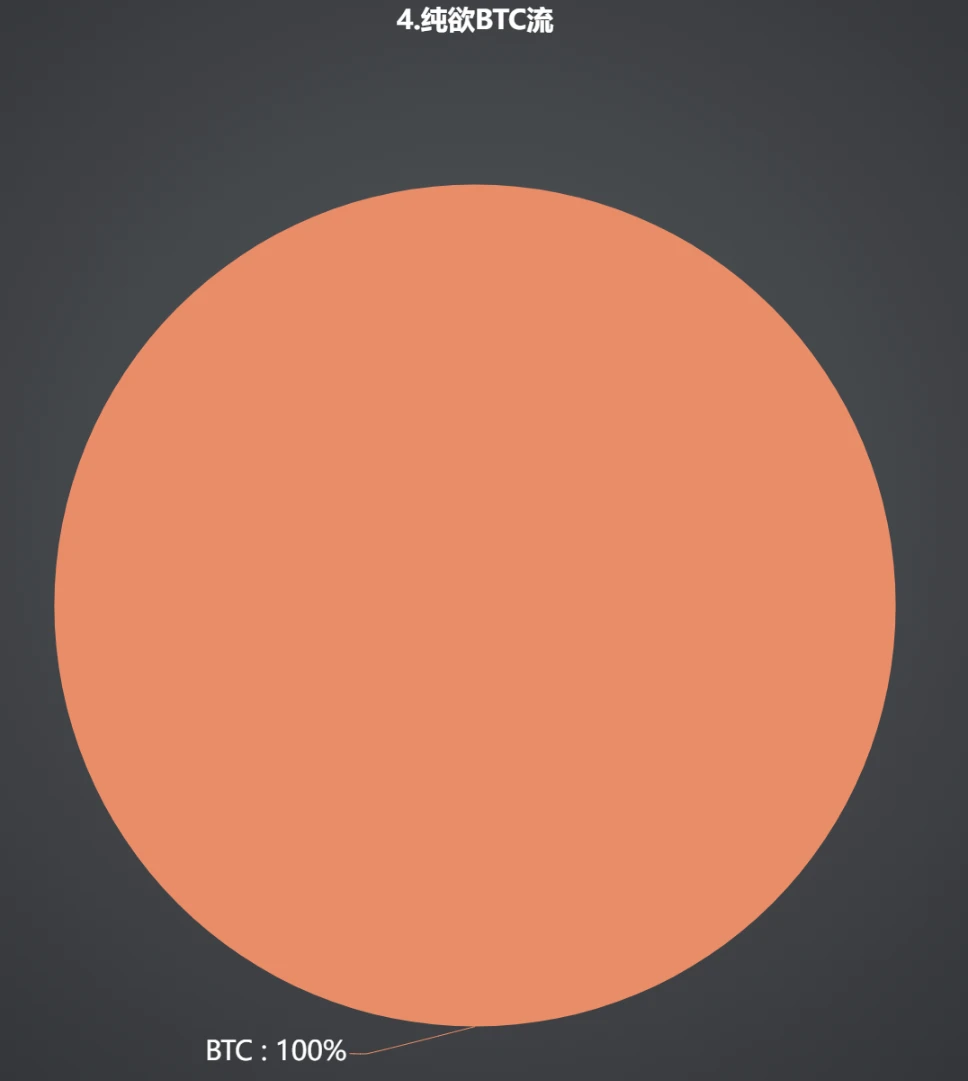 这种配置策略适用于对比特币持有极高信心的投资者。尽管未来长期可能获得较高的收益,但同样要承担当下世界极高的市场波动风险。这种策略需要投资者对比特币的历史,发展与开发程度有极为深刻的理解,并且理解,且能够接受短期内 BTC 的大幅度价值波动可能性。