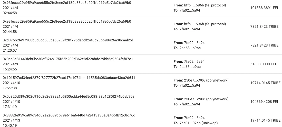 在验证通过后,连接钱包、签名后会显示该地址的历史 FEI 和 TRIBE 交易记录。同时,用户也可以选择增加交易所中的记录。