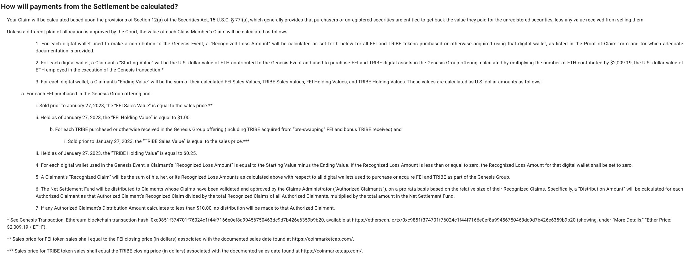 Fei Labs 与三名团队成员因在创世事件中发行未注册证券而成为集体诉讼的被告,在和解方案中,被告同意支付 1785 万美元的和解基金。但只有真正遭受损失的用户(支付的 ETH 价值小于卖出的 FEI 与 TRIBE 之和)才能获得赔偿。