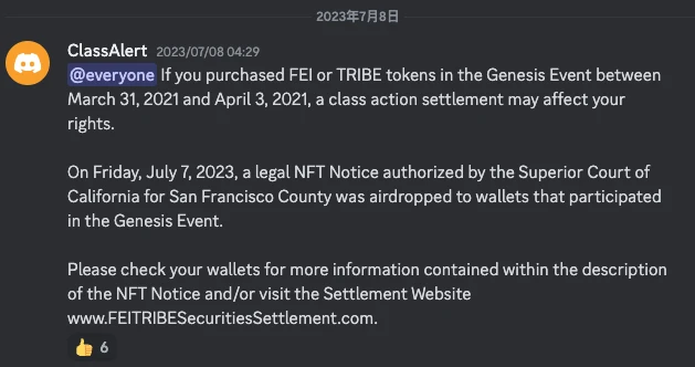 7 月 8 日,Discord 用户“ClassAlert”在 Fei Protocol 官方 Discord 发布公告称,在“创世事件”中购买了 FEI 或 TRIBE 代币的用户可以参与和解,并获得赔偿。在法律文书中,“class alert”可能用来提醒特定人群关于某个正在进行或者已经决定的诉讼事件的信息。在这种情况下,“class”通常指的是集体诉讼中的一群人。