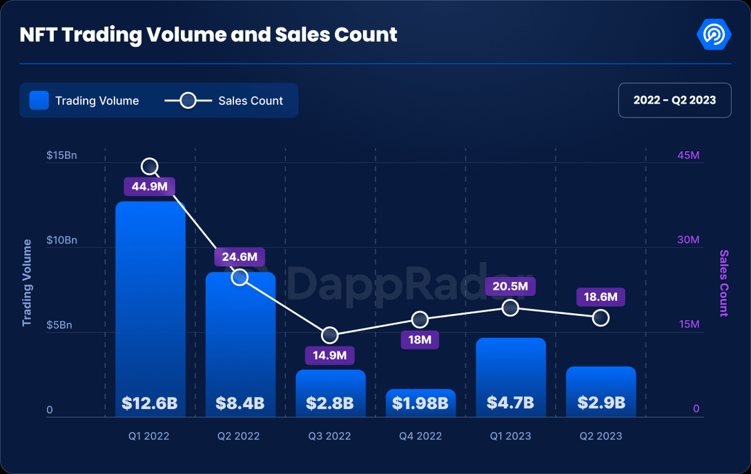 上图: 2022 年至 2023 年二季度 NFT 交易额和销售额对比