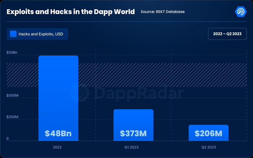 在过去的二季度里,更多独立钱包与区块链应用程序进行交互,日均独立活跃钱包(dUAW)数量较一季度增长 7.97% ,表明用户仍在持续参与和采用 Dapp,其中游戏行业也保持着 Dapp 市场主导地位。另一方面,美国证券交易委员会的监管行动对 BNB 和 Polygon 链上锁仓量产生了较大影响。与此同时,NFT 行业尽管交易额下降了 38% ,但交易量降幅并不大(仅有 9.2% ),表明市场兴趣和交易活动持续存在,而比特币 NFT 协议 Original 的迅速崛起说明用户对于新型数字资产的兴趣日益浓厚。更令人鼓舞的是,二季度加密行业漏洞利用造成的损失大幅减少,表明人们对加密生态系统安全机制的信心越来越强。