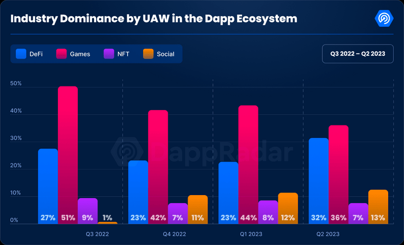游戏继续占据 Dapp 领域的主导地位,市场份额占比达到 37% ,但与上一季度 45% 的市场主导地位相比有所下降。值得注意的是,在 Memecoin 热潮和L2空投的推动下,DeFi 重新崛起,其市场主导地位占比从 23% 升至 32% ,出现了人气回升的迹象。此外,社交类 Dapp 市场主导地位占比也逐渐上涨,二季度占比约为 13% ,比上一季度增加了 1% 。 相比之下,NFT 行业的增长轨迹似乎正在放缓,主导地位降至 7% ,这一数字与 2022 年第四季度的水平相当。